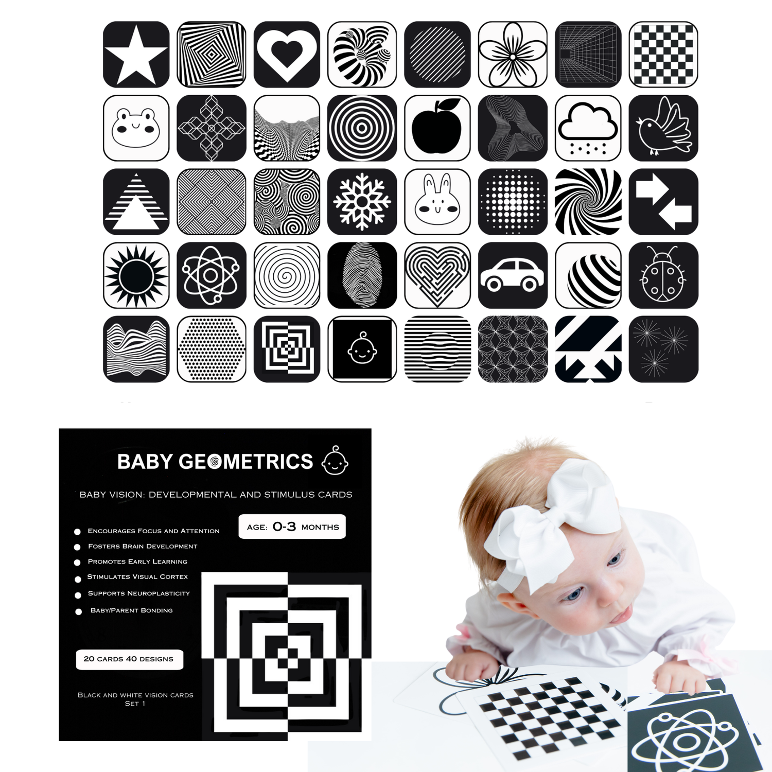 Baby Geometrics High-Contrast Flashcards (Set 1) feature bold black and white designs created to capture a baby’s attention during the earliest stages of visual development. Ideal for newborns and young infants, these cards encourage visual engagement, focus, and early tracking during tummy time or calm play.