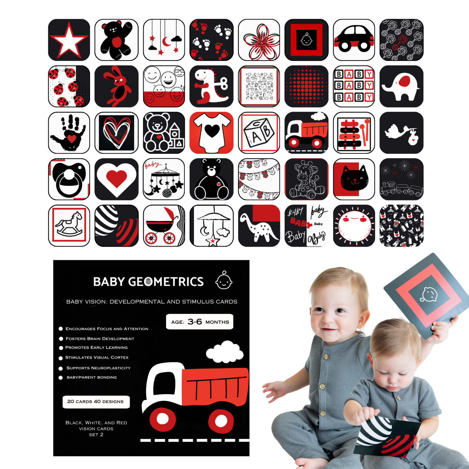 Set 2 builds on the foundation of Set 1 by introducing red accents alongside black and white—colors babies naturally respond to as their vision develops. Designed to maintain interest and support visual engagement, these cards are perfect for babies ready for a bit more visual variety.